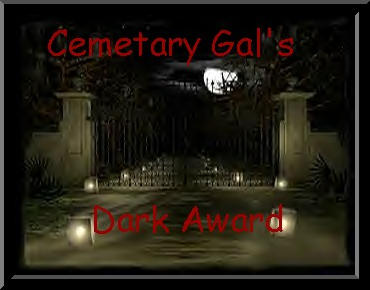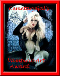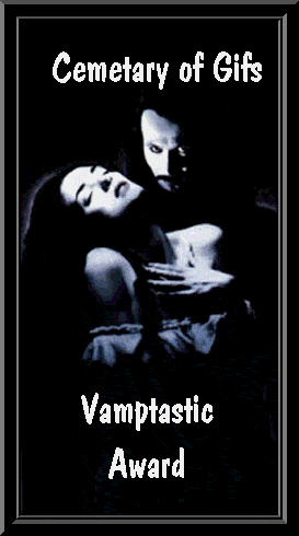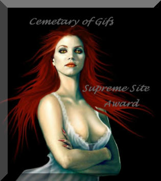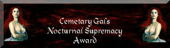 The Nocturnal Supremacy is the highest honor given from the Cemetary right now. I do, however, have other awards that might fit your page more. The Supreme Site award is 2nd step down and can go to either a dark or a normal page that is done very well. Vamptastic is a very neat vampire type page. Vampiric Art and Dark Award is for vampiric/dark pages that are good. I will try to get better descriptions of these awards up soon. I am trying to make other awards as well to fit different catagories...so you may want to check back. If you would like one of my awards I need you to email me first. In your email I will need which award you are interested in and why you think you deserve it. I will need your page URL of course also. If you recieve an award all I ask is that you link it back to my page. If I send you an award different from what you asked for it simply means I thought your page was better suited for the one I sent. Now you can look through my awards and then EMAIL ME!