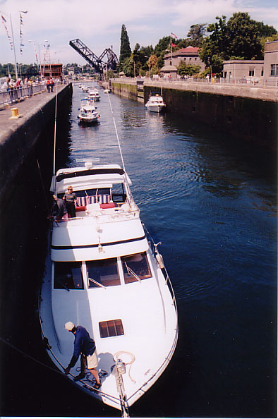 Boats entering the Hiram M. Chittenden Locks. The locks also showcase a fish ladder where salmon can bypass the locks and swim upstream to spawn.