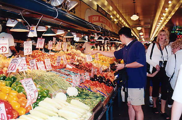 The Seattle-ite Johnny buying peachy soft Ranier cherries in Pike Place Market.