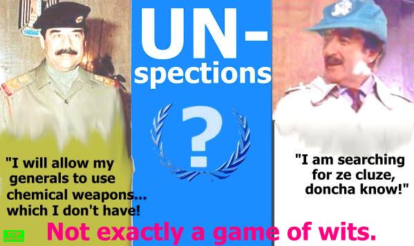 This game is kind of like the old Battleship game: on one side is the Iraqis, on the other is the U.N. Inspection Team. If the U.N. inspector finds any weapons of mass destruction, he wins. If the Iraqi player can keep the U.N. inspector guessing until he gets bored, has to call his 14 year-old girlfriend, or otherwise gives up, then HE wins. It's a lot harder than it sounds, because the Iraqi player gets to MOVE the weapons after every turn. Also, he gets a new concession card every turn, like "you sell oil to get more weapons" and "inspectors must tell in advance which square they will try next."