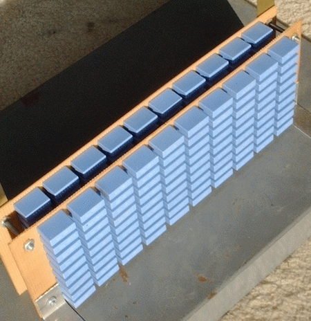 Connections between individual capacitors are made with #22 bare copper wire, wrapped twice around each lead and soldered. Capacitors are mounted on the cheapest of perfboard, and the unit has two small "L" brackets on the bottom for mounting. (seen in the frontal view)