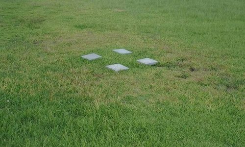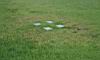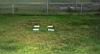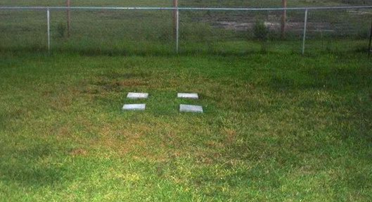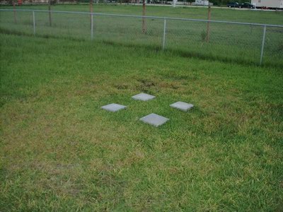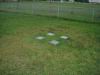 It's a little tough to make out, but can you see the ring of dead grass around the four concrete blocks? The blocks supported the primary coil of our biggest Tesla Coil system. We started noticing discoloration in the grass about 4 days after a single night of high-power runs. During those runs, the coil was pulling roughly 75 amps @ 240 volts...about 18kVA of input power. There were *constant* powerarcs to the ground, with very few streamers. Notice that the grass is still green immediately around and between the concrete blocks. There were no hits to this area as the primary coil took the hits instead ; )