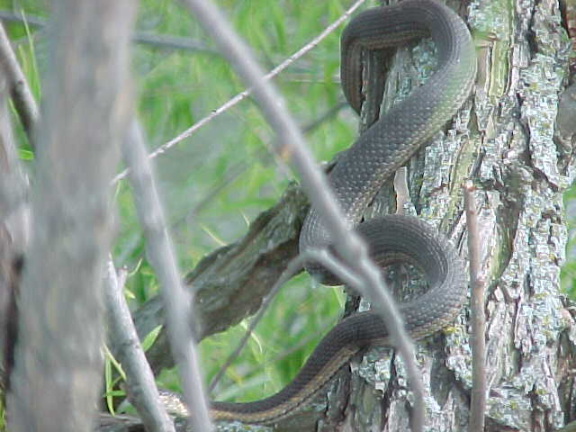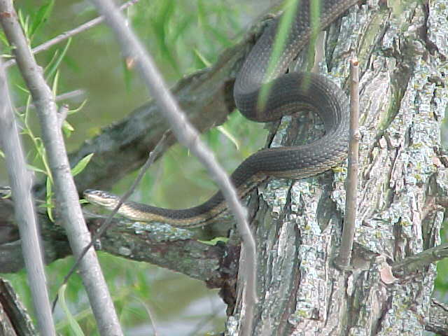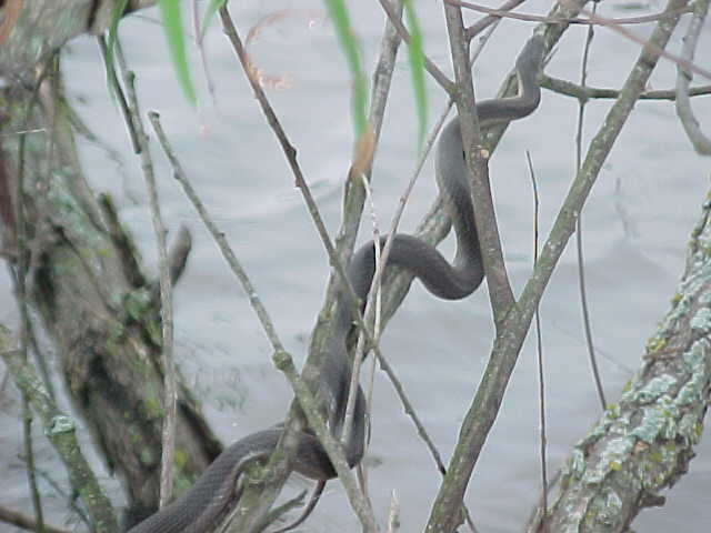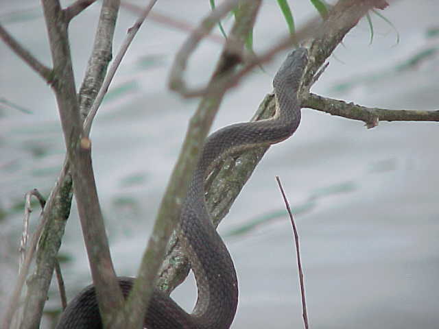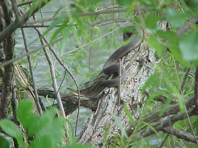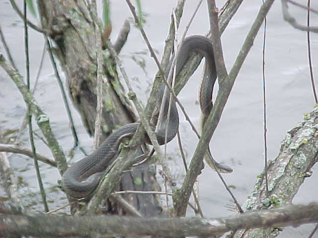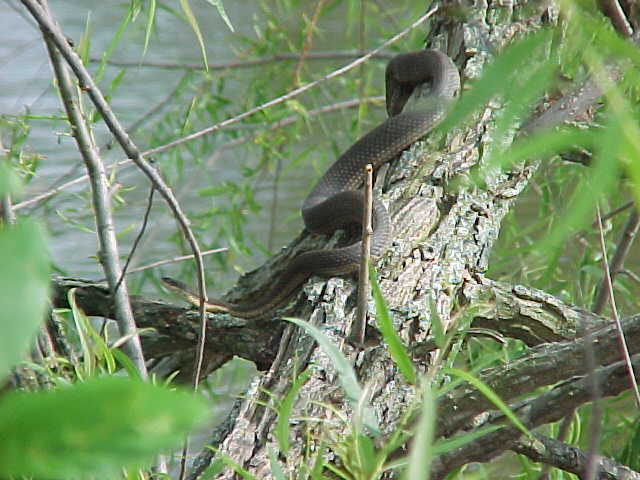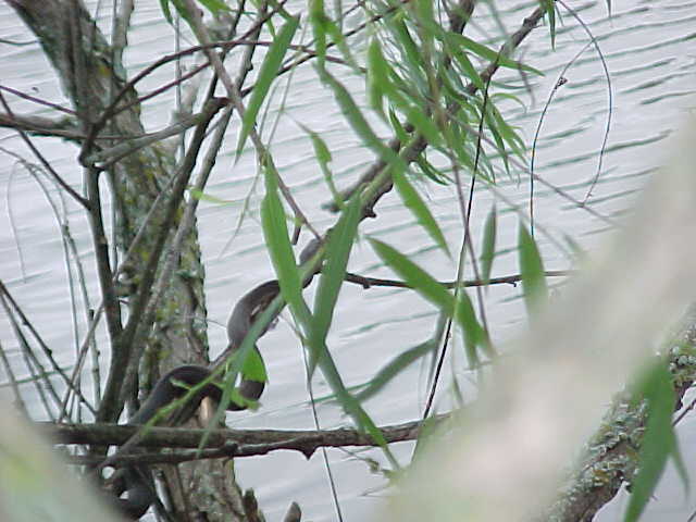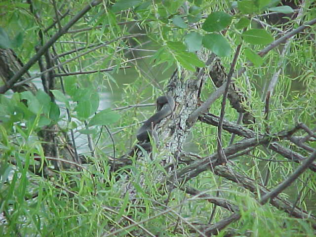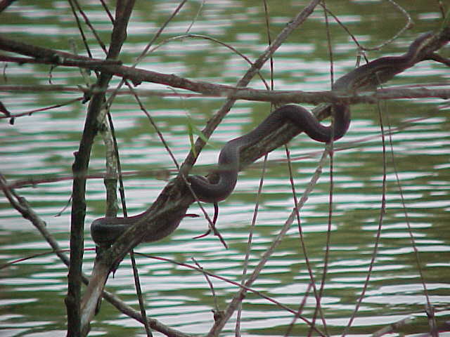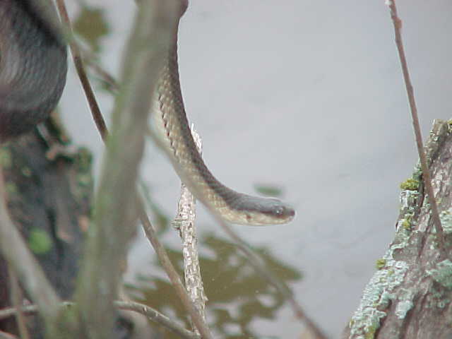 I kept walking, and noticed that every time I passed a tree overhanging the water something would fall, and make a splashing noise. Since there were a lot of floating logs in the water, I figured that turtles were jumping off as I walked by, since I had seen them doing it when I first walked up to the pond. But there was something a little different about this sound - it was much closer to the shore, and had a not so "heavy" sounding. Like throwing a small stick in the water compared to a brick. So I started watching carefully as I passed each overhanging limb......and lo and behold, there were snakes dropping from them like mad. So I started walking reeaall slllowww, being quiet, and was able to sneak up on this rather large Graham's Crayfish Snake with a camera. It was basking on this tree, and even though I got fairly close (5 feet), there's no doubt that snake knew I was there. It eventually let itself fall into the water, very controlled. It didn't crawl down the limb for a second, or catch it's tail on the way down. It was a though-out maneuver I'm sure. The snake simply did a complete "turn" on it's long axis (head to tail), and the whole snake went straight down at once. Interesting how they've learned to do it so quick like that.