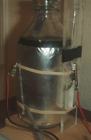 Tank Capacitor is a single "Promised Land" glass milk bottle. The outside has been wrapped with aluminum foil for one plate, the other plate is the saltwater within.