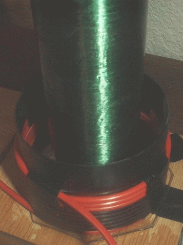Primary Coil is nothing more than 10 or 12 turns of speaker wire helically wound on a few inches of polypropylene plastic, from a flourescent light protector tube.