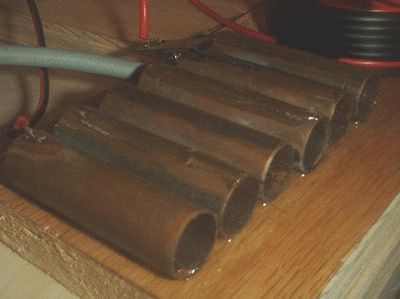 Spark Gap is five, 3/4" O.D. x 2" long copper tube sections, epoxied onto a small plywood base with small air gaps in between. Total gap spacing is close to 1/8". No cooling air is used, and the unit gets quite hot after a couple 2 minute runs.