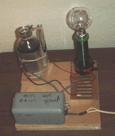 Performance: This coil was not built with performance in mind. It was constructed for no other reason than the heck of it. The junk was laying around the shop, and we figured it could be thrown together in less than a couple of hours with a minimum of work. So we did - and we're almost impressed with it ; ) It will give a continuous writhing 3" violet arc to ground, and will flicker a flourescent bulb 3 feet away due to the high frequency. We're really not even sure if it's in tune, but who cares. It works, it's finished.
