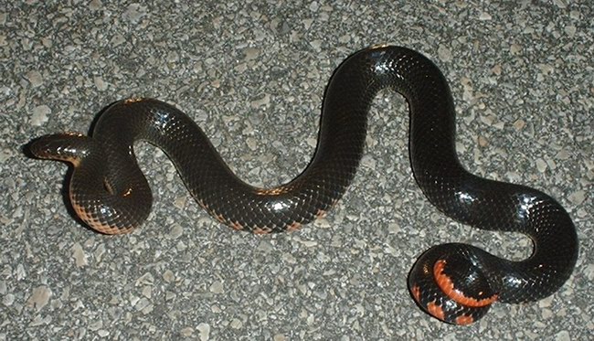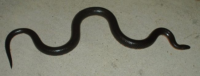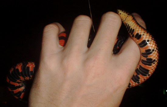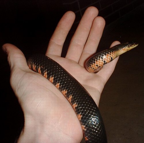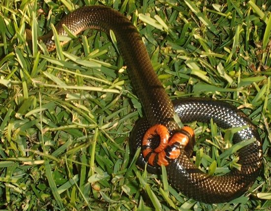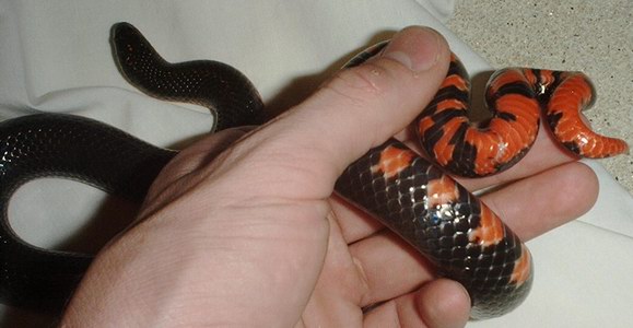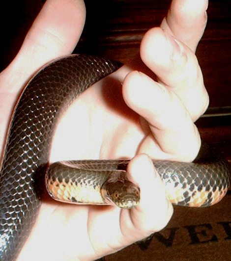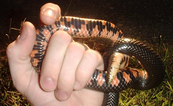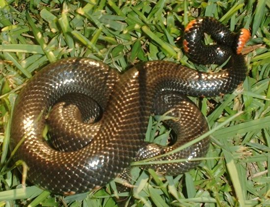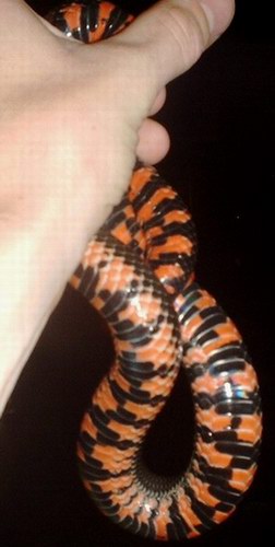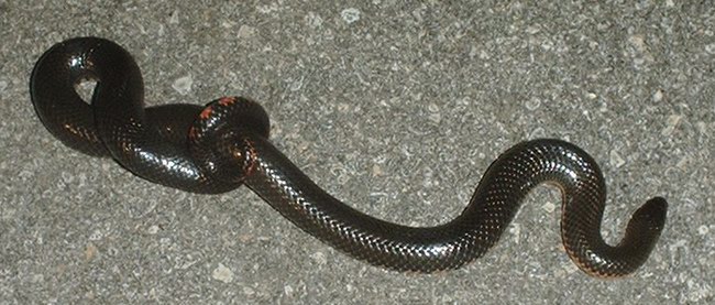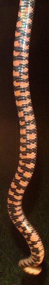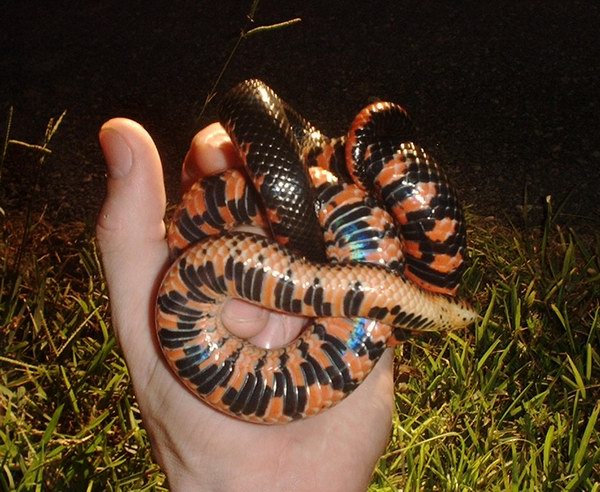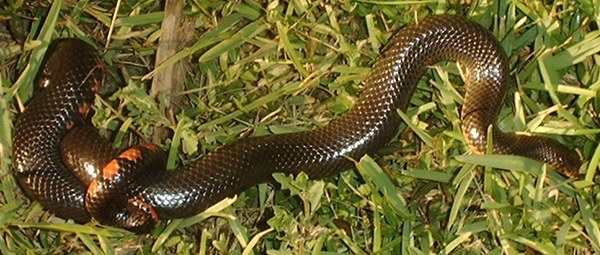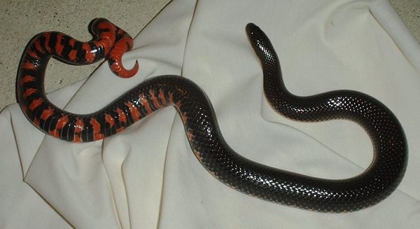 Despite its name, the Western Mud Snake is one of the most beautiful of all reptiles. As seen in the pictures above, mudsnakes are characterized by a glossy jet-black topside, and staggered "checkerboard" of pinkish/reddish color underneath.