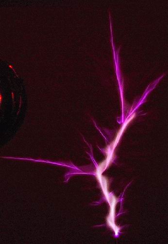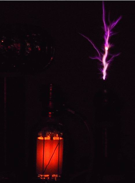 Rick is relatively new to the HV hobby and has come a long way in a very short time as the pictures reflect. The first picture is his VTTC, based on a single 810 and arcs about 7". I grabbed an old HeNe laser of mine, and let his coil arc to the anode lead. YES! It ran the laser quite well as you can see.