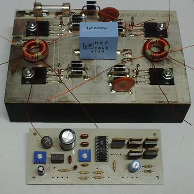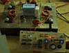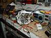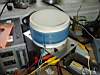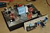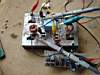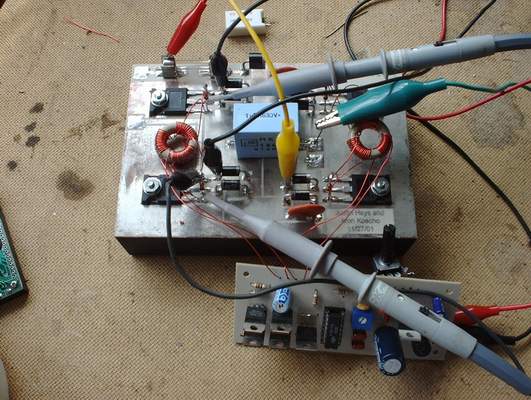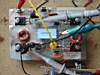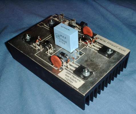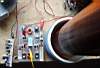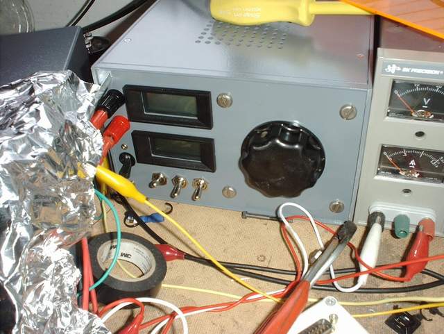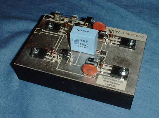In the pictures labeled "HV testing", this is how it was set up when we ran into some reliability problems. We used Aron's beautiful new power supply to power the coil, it makes 0 - 400V with the option of 1/2 wave rectified, full wave, or filtered DC output...perfect for SSTC experimentation. Anyhow, we ran the voltage up slowly to 100V...sparks are about 4" long (I forget exact sparklengths vs. voltage.....don't count on those figures...) So we run the voltage up to 100, and Aron pulls an arc off with a wrench, and the fuse blows. To make a long one short, one of the SF56 high-speed diodes died, as well as only a single (surprising) MOSFET. After replacing the two relatively expensive parts, Aron keeps his hands away from the output, at least until we get the problems solved ; )