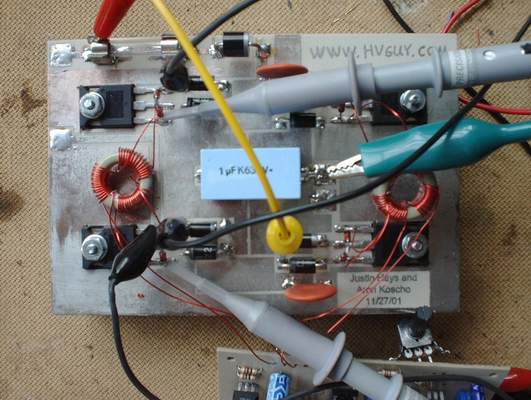 The superfast diodes are rated 400V, the MOSFET's are IRFP460's rated 500V @ 20A. We think the main problem is that the electronics weren't in an RF tight enclosure. All KINDS of stuff was getting coupled to other stuff, we found the coil to be MUCH more reliable with tin foil wrapped around it. And we all know that tin-foil-wrapped-electronics is hell to work with, so we're bolting everything in a nice metal case tomorrow when we wake up at lunchtime. (I JUST DID, I also ran coax to the isolation transformers and to the tuning pot.....everything is MUCH more stable)
