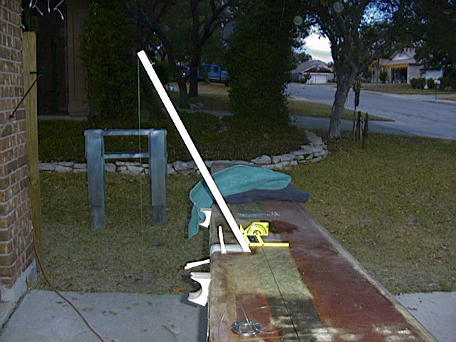 Here you can better see the plumb line. The little yellow guage tells me if this "gear leg" is at the same angle as the other one. The exact degree wasn't too important, as long as they are both the same. As a third check, the leg is adjusted so that it is square (parallel) to the black line running the length of the canard. This helps me to ensure there's no "toe in or out"