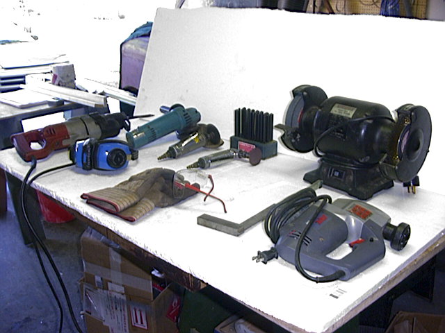 Sawzall, jigsaw, grinder, angle head air grinder, high speed cutoff tool, bench grinder, transfer punches, 4 inch grinder, drill press, wide belt edge sander, hydraulic press, various layout tools. It seems that even the small projects require most of the tools in the shop!