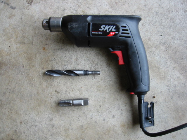 Tools: center punch, wrench to turn tap, drill, 3/8 NPT tap, 37/64 tap bit, and a couple of smaller