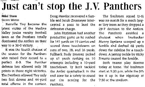 This was a total and complete ass whipping. First of all, there is a deep seated hatred of Tivy among each and every one of us. And second of all, we totally dominated the night. Fitz scored three times. I had three tackles, a sack, and a fumble recovery, in only one half on defense. All I know is that the bus ride home was a good one, even though it took over an hour and it was cold that night.