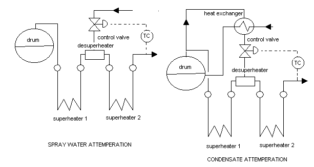 Solids after attemperation=(90x0 +10x15)/100=1.5 ppm,which is too much.[In this equation,steam is considered to have nearly zero solids]. Typically depending on steam pressure and turbine make,solids permitted in final steam could range from 30 to 150 ppb(parts per billion). Hence in such cases, a heat exchanger could be used to cool the steam and then inject the condensate between the two stages. This exchanger could be located inside the drum and be cooled by the boiler water itself. However another option is to use a separate exchanger as shown above and use it to cool some steam taken from the drum and then inject it as spray. The condensed steam has nearly zero solids and hence is considered suitable for spray.