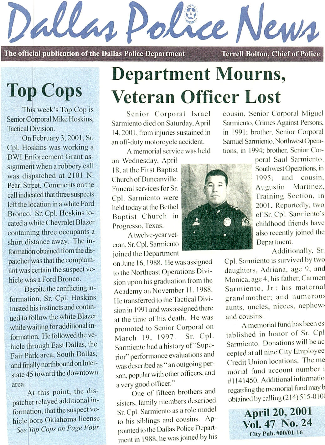 This page is dedicated in the memory and honor of Senior Corparal Israel "Izzy" Sarmiento who is pictured above. Izzy is from the town of Progresso, T.X. He has 14 brothers and sisters. He has two daughters who live in south Texas. He joined the Dallas Police Department in 1988. Izzy served on tactical for 10 years. He is in the eyes of many including me one of the best officers out there today. He is also a role model to many. Israel loved his job so much that he encouraged many family members and friends to become police officers. Izzy liked to help people as much as he could.His unexpectedly passed away on April 16,2001 at the age of 38. Izzy helped me make the right dcisions many times and I owe him alot for helping me make decisons when I needed help in deciding what to do. Izzy thanks for all you have done for me and everyone.You will always be remembered and never forgoten. R.I.P.