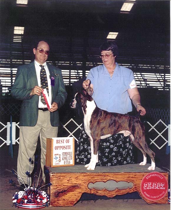 is retired from the show ring. He is occasionally shown, but mostly he just loves the couch. He is shown here taking BOS against other specials in Stephenville Texas in June 2002 Doc lives at home with his owners, John