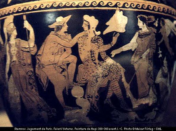 Aphrodite's role in the Judgement of Paris was the precursor to a decade long war. It all began at the wedding of Thetis, a sea nymph, and the mortal Peleus. Every immortal was invited to the wedding, with only one exception; Eris (Strife). Eris was offended at being the only uninvited that Eris decided to roll a golden apple across the floor that was marked, "For the Fairest". Hera, Athena, and Aphrodite all claimed that the apple was theirs and fought over who should keep it. Zeus decided to let Paris, a young sheppard decide. Unknown at the time, Paris was really a Trojan prince who was sent away by his father, Priam, as an infant because it was prophisied that he would be the downfall of Troy.