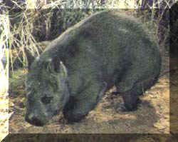 The Wombat is dark brown in colour and looks like a baby bear. It has a large head with a thick snout, thick whiskers and short stumpy legs with sharp claws. It weighs about 26kgs (55 lbs) and is about 1 meter (3 ft) long.