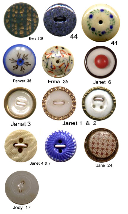 Buttons on this page are from the collections of: Erma Juergensen, Denver Elliott, Janet White, Jane Leslie, Jody Behrbaum, Kareen Strumpel, Jerry Brandt, Diane Whisnant, Sara Buck, Joan MacFarlane, Susannah Jordan, and Joy LeCount.