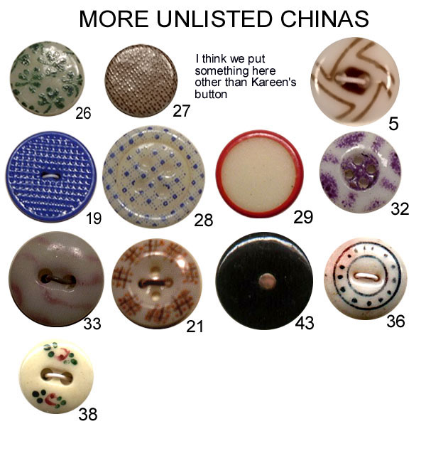 At the 2001 National Button Society Show in Denver china collectors from all over the country met to share information about their favorite china buttons. Many of these buttons were ones that were not included in the Guidelines to Collecting China Buttons, the definitive guide for china collectors. Many of these buttons were photographed at that meeting and appear here for your viewing.Our very special thanks to all of you who brought your china buttons to the Denver meeting and allowed us to share them. Thank you, LeRoy Manley, for photographing the buttons at the Denver show and thanks to Karen Kline for editing them for use on the website.