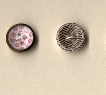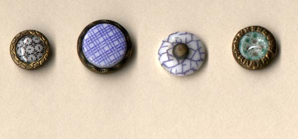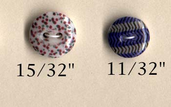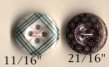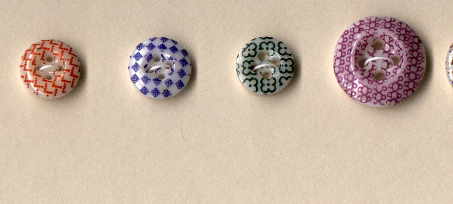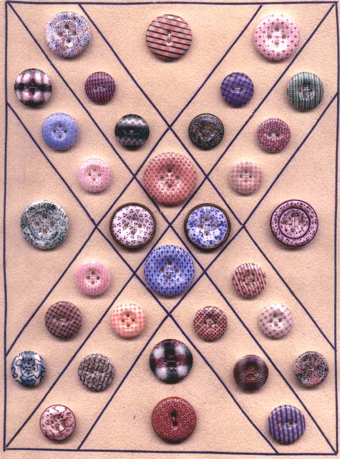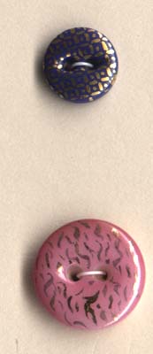 The beautiful calicoes shown here are from the Lorah/Morgan collection. The extensive collection of Mr. Wilfred Morgan and Lester and Beatrice Lorah was the basis for the identification of patterns for the Guidelines for Collecting China Buttons. The collection was acquired in the 1980's by Millicent Safro and Diana Epstein (see article by Janet White in the December 2002 edition of National Button Bulletin). We owe all of these collectors our gratitude for preserving these examples and for sharing their knowledge with us.Shown here are extraordinary examples of china calicoes including calicoes on fisheye bodies and also examples of ginghams and unusual spatter patterns: