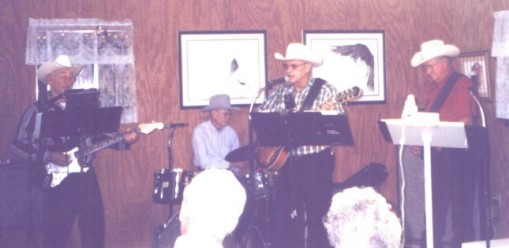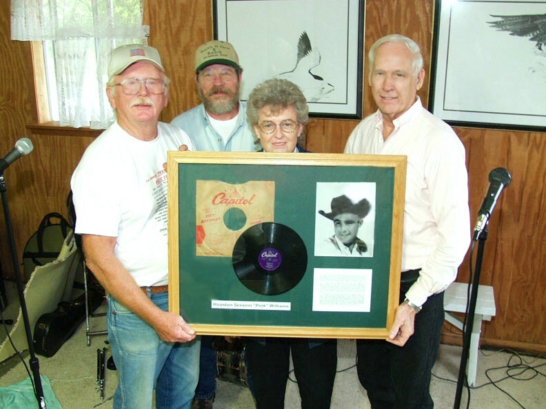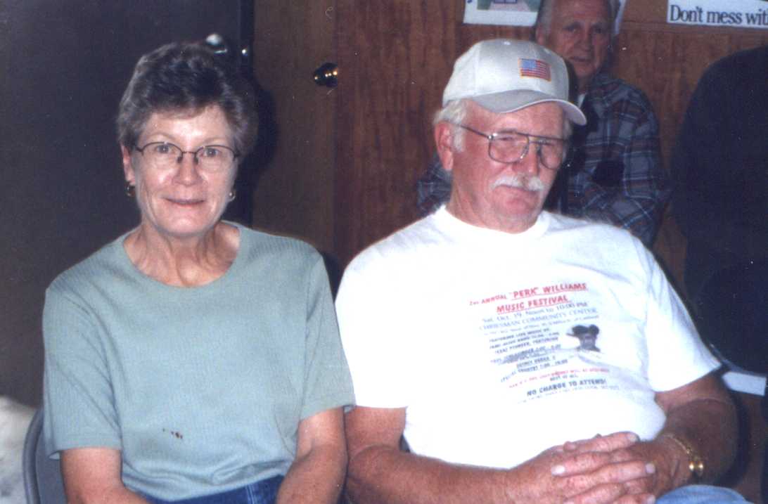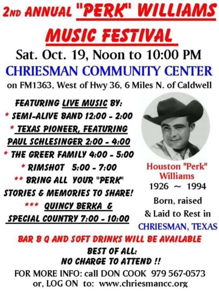 PERK WILLIAMS' FRIENDS and admirers gather on Saturday in Chriesman at the 2ND ANNUAL TRIBUTE to the famed fiddle player and singer. Pictured above from left are DON COOK of the Chriesman Citizens Center; musicians,