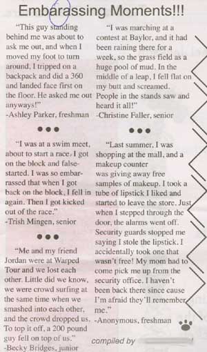 The first article, titled "I find this happy", was a list of things that makes some high school retard happy. Stupid things. Things that shouldn't be printed in a paper intended for an entire high school, things like "Inside jokes with friends: 'And I had.. nothing to wear' " or "Visiting Mamaw at 'the lake.' " I don't even know if "Mamaw" is a typo. But this girl had a lot of typos. She had eight, in this one tiny little article. And she mixed pronouns, interchanging "who" and "I" freely. And she said that she wanted to be nice to other people, and to do this, she listed a bunch of boring crap that only SHE thinks is funny. And she had the gall to say, "You know you got a kick out of it." Loser.