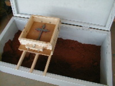 I made a wooden sand box to store my PetroBond sand in. I ram my molds over the box as pictured above. This is much more convenient than my old method. I loose much less sand this way. The box is made out of a single 4'x8' sheet of 3/8" plywood. I trimmed the top, bottom, and lid with 2" furring strips. It also has 4 cross supports under the bottom panel. It has 100 lbs of sand in it now. I think it will hold up to 400 lbs with no problem (strength or volume). I eventually plan to make a workbench that it will slide into.