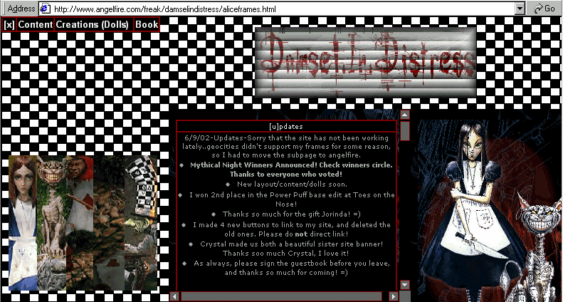 This is the site of the month winner for August Amanda of Damsel in Distress. I love this site so much it's amazing honestly I couldn't say enough about it. Her dollz she has are the most interesting unique dollz I've seen. They are just great they're more of a darker image yet show just enough color in them. The way she shades, and everything I totally love the site I've seen the whole site yet I always go back and look at it againit's wonderful. She's got more then just dollz too she has some of her own artwork, which is really good too. Her layout as you've probaly read that's a description with her link is great I love it. You have to check out her site and dollz if you haven't already I'd bet you agree with me.