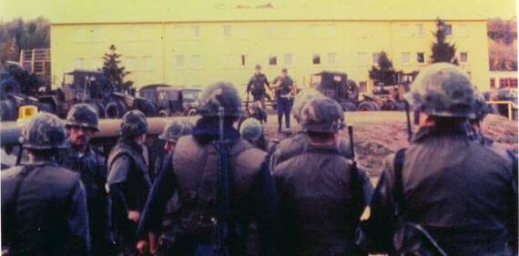 Kriegsfeld Depot, circa, 1980 MP’s assemble outside the MP Barracks awaiting assignment. Between the platoon (foreground) and the MP barracks (background) is the 619th Motor Pool parking lot. The annex built on each end of the barracks building is the last four windows on each end. Photograph courtesy of Mike Yurk |