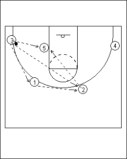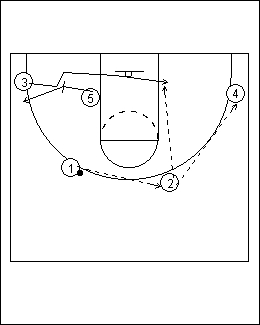 3 looks for 5 posting up. 3 may skip pass to 2 for the shot or the pass inside to 5. Or 3 may pass to 1 who passes to 2. |