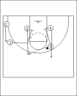 If unable to pass to 4, 2 will reverse the ball to 3. 5 crosses the lane and sets a screen for 4. 4 comes off the screen looking for a pass from 3. 3 also has the option to drive right as 5 screens. |