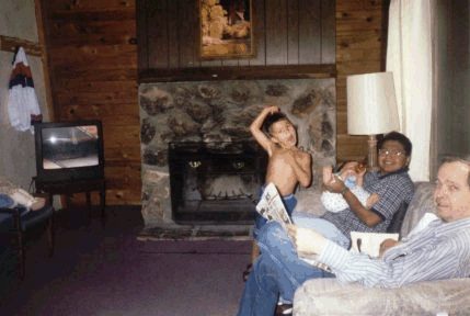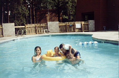 Pool at the cabins. Kids try to drown Rene. |
