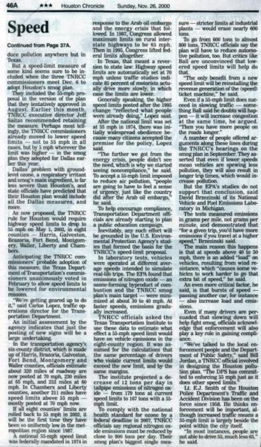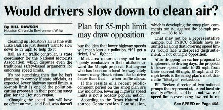 Going back to 55 will NEVER change rush hour traffic and long commutes, along with the smog issue in the 8-county region. Here's an earlier article from the Houston Chronicle (11/26/00):
