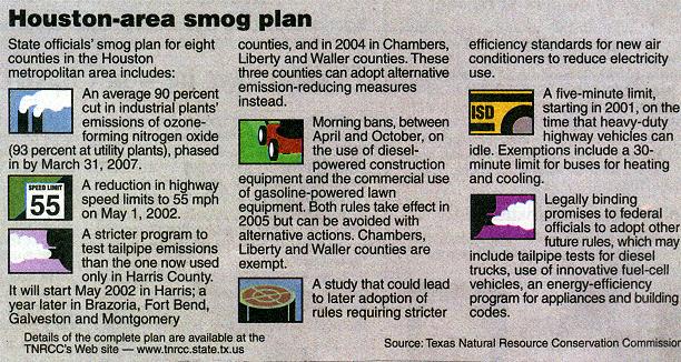 10/16/01 update: the TNRCC's 5-year plan has been approved by Governor Rick Perry, and as of this writing, 13 lawsuits have been filed against the State of Texas challenging several key elements, like the lowered speed limit. If the highway signs are switched on May 1, 2002, the 8-county region will return to a 1970s-era throwback since the Arab Oil Embargo of 1973. Anyone remember the 'Laid Back at 55' TV commercials during the late 1970s/early 1980s or Smokey and the Bandit? Resist now by filing a lawsuit against the state and TNRCC. Much like the Florida recounts during the presidential election, lowering the speed limit does not solve anything at all; it's flawed logic will lead to increased traffic congestion, especially on Houston-area highways built in their 1960s-era configuration (Katy Freeway and the West Loop).