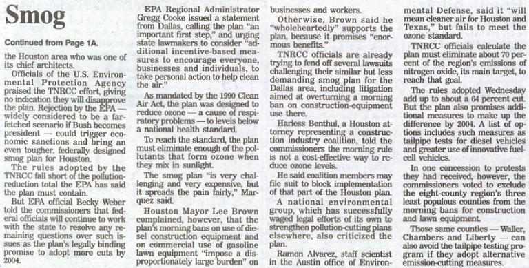 Texans rebelled against centralized vehicle emission testing in 1995 with civil suits; a lot more will be rampant in the next few years. Grievances should be sent ot the following organizations: