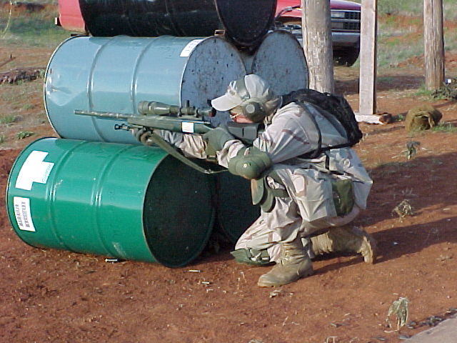 The next event was called Waltzing the Barrels. In this event there was a set of barrels setup in a pyramid. The shooter started in the prone position firing from the left side. If you were left handed you started on the right side. The idea was for you to fire off your weak side. You engaged a steel Half-silhouette target at 400 yards with 2 rounds. After that you took up either a sitting, kneeling, or squatting position and again fired two rounds. You had to remain behind cover while firing. After firing both rounds you then took up a standing position and you fired two rounds again. You then either took up a sitting, kneeling, or squatting position and again fired two round. After that you took up a prone position and fired two rounds, for a total of 10 rounds. Again you are firing on a steel target and its hit or miss.