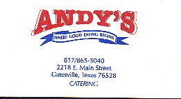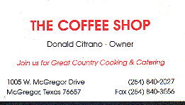 SALMON LAKE PARK AT GRAPELAND TX.FLOYD AND FANNIE SALMON HAVE BUILT A SHOW PLACE IN EAST TEXAS. ------------------------------------------------------------ The first weekend in September is serious "Toe-Tapping" fun at the scenic Salmon Lake Park in Grapeland, the host of one of the largest annual bluegrass festivals. Continuous music from well-known musicians will perform day and night. Bring your lawn chairs and blankets and enjoy music, arts and crafts, food and fellowship. It is a true family affair - no alcohol allowed. The 20-acre Salmon Lake Park is located 1 mile west of Grapeland and 13 miles north of Crockett. Take US 287 Business to Grapeland, go west on FM Rd. 227, and follow the signs to the park. The park is open year round and provides a unique area for camping, recreation, lodging, swimming, family reunions, and RV clubs. The park features a "Downtown" that has been created from 40 refurbished old buildings and memorabilia that recall life before World War II. Overnight lodging is available in several old buildings refurbished into cabins. Most sleep 4-6 persons and feature kitchenettes. A 2-story, dorm-style "hotel" sleeps 13 and offers a large kitchen dining area. The park offers 400 RV sites and about 50 primitive campsites. The "swimming hole" offers a platform and elevated diving board. A separate fishing pond is offered. For additional information or reservations write to Floyd and Fannie Salmon, Box 483, Grapeland, TX 75844 or call (409) 687-2594. ![]() ![]() 1700 ft. Grass Air Strip 1000 ft. Good Approach For more information call 409-687-2594 CLICK HERE FOR GRAPELAND TX WEB PAGE ########## COUSHATTE RANCH RV PARK ########## ![]() ![]() DO YOU LIKE TO EAT ?--TRY ANDY'S CAFE IN GATESVILLE,TX.AT THE CORNER OF HIGWAYS 36 AND 84...THIS ISN'T A DINING PLACE..IT'S AN EATING PLACE IF YOU ARE HUNGRY. ########## ![]() ANOTHER GREAT PLACE TO EAT IF YOU ARE HUNGRY ! ![]() HIGHWAY 84 WEST McGREGOR, TX. #################### LOST MAPLES STATE PARK ![]() LOST MAPLES STATE PARK IN THE GREAT STATE OF TEXAS !!FALL FOLIAGE PEAKS ABOUT THE MIDDLE OF NOVEMBER.ONE OF THE MOST BEAUTIFUL AREAS OF TEXAS TO VISIT. ![]() CLICK HERE FOR WEB PAGE ########### HOMEPLACE ACRES ########## OAKDALE PARK ![]() ![]() OAKDALE PARK ,GLEN ROSE TX. PROBABLY ONE OF THE OLDEST RV PARKS IN TEXAS.LARGE SWIMMING POOL,FULL HOOKUPS,LARGE REC HALL,CABINS,3 BLUEGRASS EVENTS PER YEAR.ON BANK OF THE PALUXY RIVER,NEAR THE BRAZOS RIVER.817-897-2321 CLICK HERE FOR WEB SITE Send me mail ########## TRES RIOS RV PARK ####################