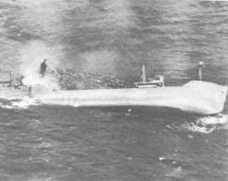 A tanker sunk by Lexington planes northwest of Saipan on June 11, 1944. Many survivors were picked up by the ship which took this picture.