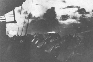 The whole attack was typical of a new style suicide raid. Largely gone were the days when twelve friendly fighters could gloriously wipe out an attacking force of twice that number, and so, too, were the long and nerve-wracking night attacks, such as that in which the Lexington had been hit before. Now the attacking planes refused to shoot it out with our defenders. With great skill they made all possible use of available cloud cover, which was heavy at the time "good Kamikaze weather," as the fleet had learned to know in order to evade our fighters. On sighting