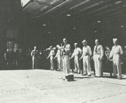 During April and the first half of May, 1945, the Lexington underwent extensive overhaul at the Navy Yard. On May 18 the ship left Seattle for Alameda California. There she took aboard planes and passengers for Pearl Harbor, including Rear Admiral Richard E. Byrd, and on May 29 departed for the thrid time from the United States for combat duty.
