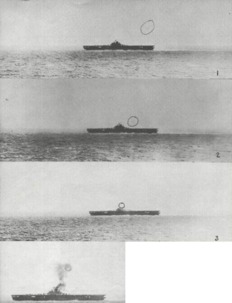 The final dive was as determined as the approach had been elusive. The first plane was deflected only because the tail was completely shot off by a five-inch shell. The second plane, though seen to shudder numerous times from the impact of the explosive shells poured into it, and though on the point of disintegration when it struck, held on it's course, dropped it's bombs and crashed into the straboard side of the island structure aft.