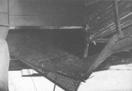 Storm damage at sea. Part of the starboard walkway, under the forward edge of the flight deck, after a storm.