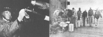 (Left) The nose is adjusted on a rocket before the first Tokyo strike. These high-speed projectiles did damage out of all proportion to their size. (Right) Lunch for the flight deck crew is brought up on the bomb elevator. By the end of the war, the ship remained at "G.Q.," all day during strikes days, and the crew was served hot food at special topside feeding stations.