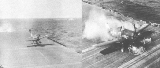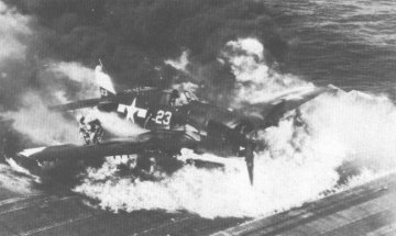 On Febuary 21, 1945, a Hellcat, back from a routine hop, came aborad with a belly tank half-full. When he "caught a wire" and jerked to a stop, the tank broke loose from it's fastenings and burst open under the still-whirling propellor. What ensured is shown in the pictures that follow.
