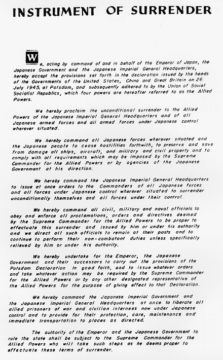 On September 2, 1945, the Japanese representatives signed the official Instrument of Surrender, prepared by the War Department and approved by President Truman. It set out in eight short paragraphs the complete capitulation of Japan. The opening words, "We, acting by command of and in behalf of the Emperor of Japan," signified the importance attached to the Emperor's role by the Americans who drafted the document. The short second paragraph went straight to the heart of the matter: "We hereby proclaim the unconditional surrender to the Allied Powers of the Japanese Imperial General Headquarters and of all Japanese armed forces and all armed forces under Japanese control wherever situated."