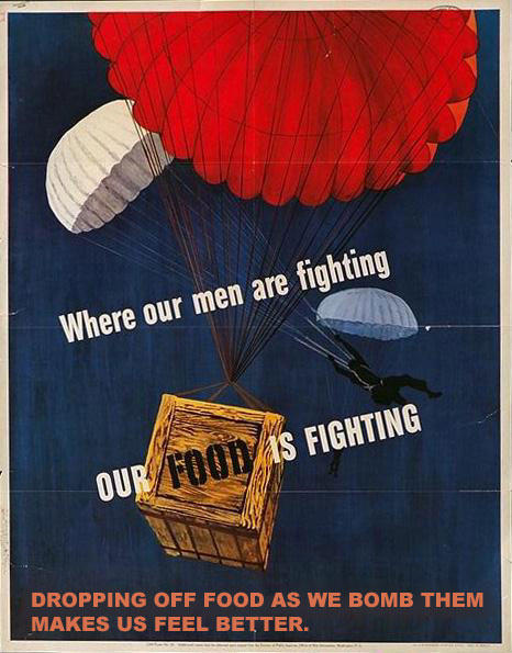 This is our responsibility as the "peacekeepers" of the world to bomb brown people. That's right! We bomb brown people. Iraq, Afghanistan, Libya. You have brown people, you can be sure we're gonna bomb them. We don't bomb white people. The only instance of us bombing white people is Germany. And that's only because they were trying to steal our job. It's our job to "democratize the world" as we eloquently say. We'll be damned if anyone tries to take over our job of world domination.