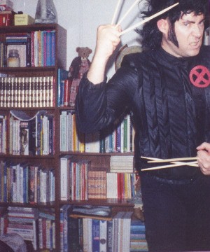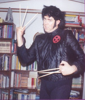 I filmed an X-Men music video back in 2001. For the video, I used the song "Don't Bring Me Down" by ELO. I grew extra long sideburns for this occasion. I used a black leather jacket that I bought at a flea market and added a red X to the front. I used chop sticks for Wolverine's claws. I used a black wig for the hair and stretched the ends to give it the famous Wolverine look.